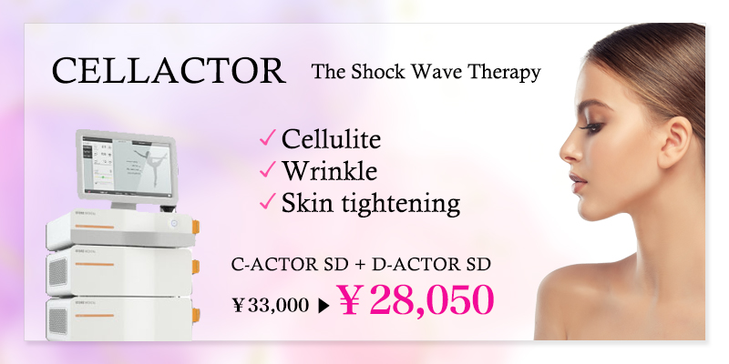 The Shock Waves are the distinctive strong pressure waves that are transmitted at faster than supersonic speed. For non-invasive body slimming, we employ the device called CELLACTOR, which loads two types of shock waves; one is the converging focused type called C-ACTOR, and the other, the scattering radial type called D-ACTOR. Utilizing two handpieces, CELLACTOR breaks and reduces the stored white adipose (fat) tissue, expels triglyceride to the outside, and then powerfully flushes away the destructed fat tissue along with body wastes. Other than body slimming by decomposing fat and stringy cellulite, CELLACTOR is able to treat stiffened, deteriorated muscle and fascia (relieving the pain and the lump within) and dramatically changing the figure and the contour to attain the ideal body shape.