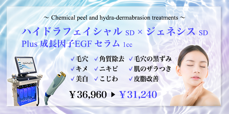 ハイドラフェイシャルは、新世代のケミカルピーリングとダーマブレージョン(皮膚を軽く研磨する)システムです。毛穴のつまりやニキビ・ニキビ跡、小じわなどに効果があります。ソリューションが対流した状態で皮膚のクレンジング、研磨、ケミカルピールと保湿を同時に行いますので、ケミカルピーリングに特有の刺激もなく、治療後の赤みや皮膚の落屑などのダウンタイムもない快適な治療です。